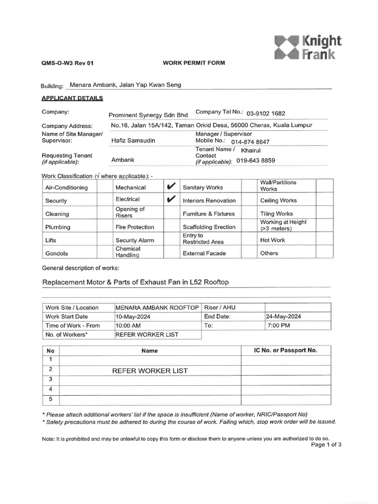 MAB Work Permit - Replacement Motor & Parts of Exhaust Fan | PDF