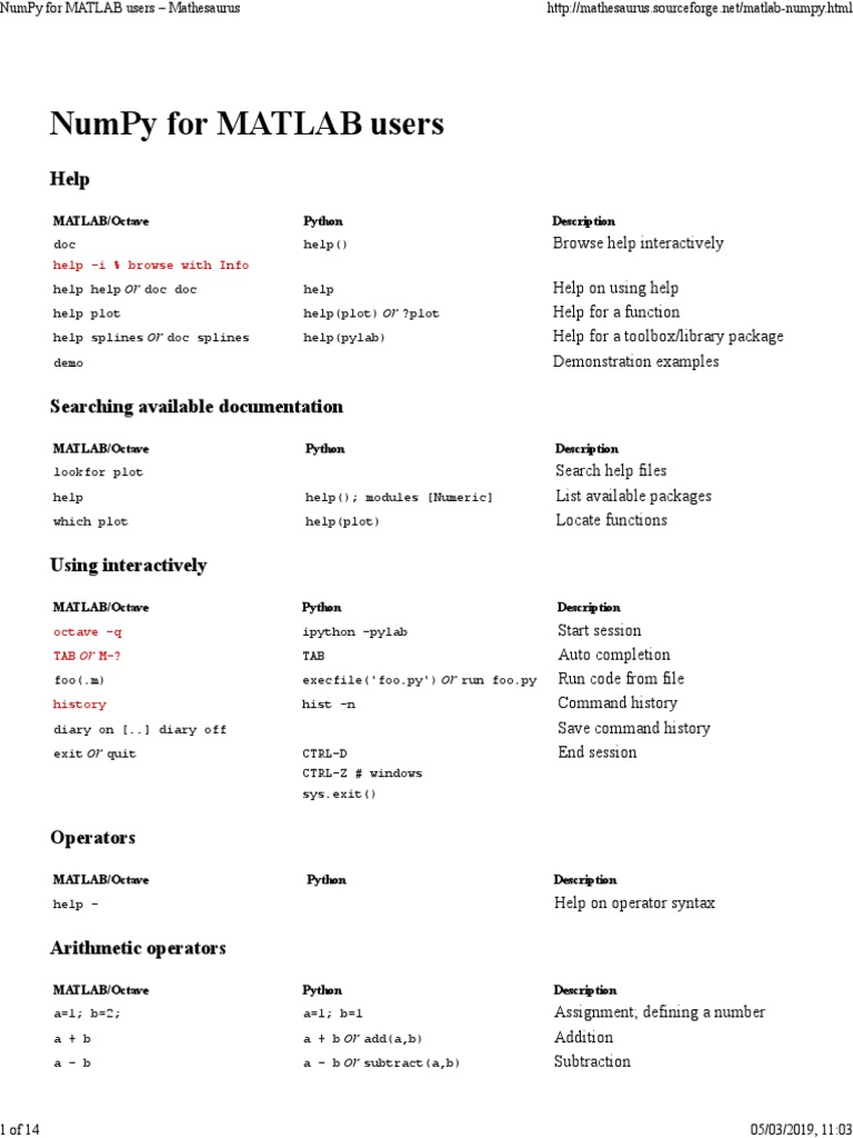 NumPy For MATLAB Users - Mathesaurus | PDF | Matrix (Mathematics ...
