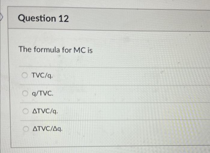 Solved The formula for MC is TVC/q. q/TVC. TVC/q. ΔTVC/Δq. | Chegg.com