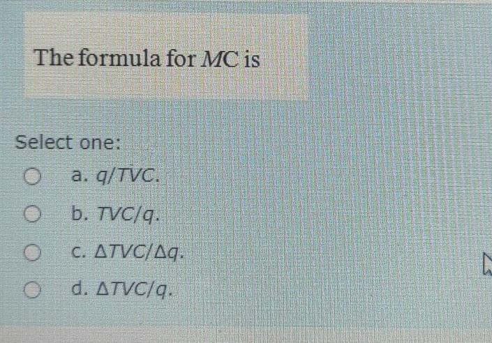Solved The formula for MC is n Select one: a. q/TVC. ob. | Chegg.com