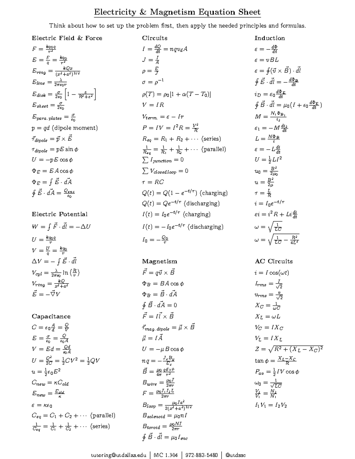 Electromagnetism MC Equation Sheet - Key Formulas & Principles - Studocu