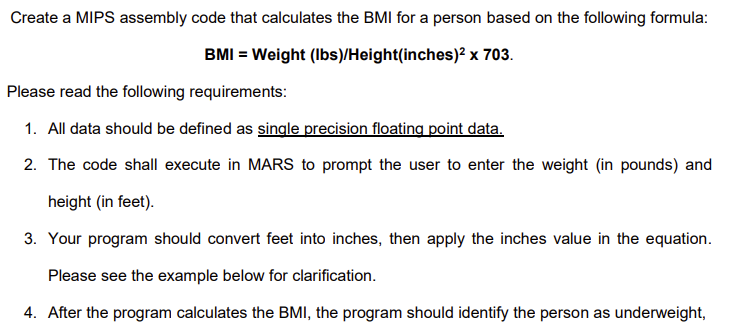 Solved Create a MIPS assembly code that calculates the BMI | Chegg.com