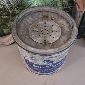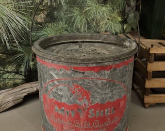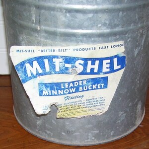 Vtg Mit-Shel Galvanized Floating Minnow Bait Bucket Blue Graphics with ...