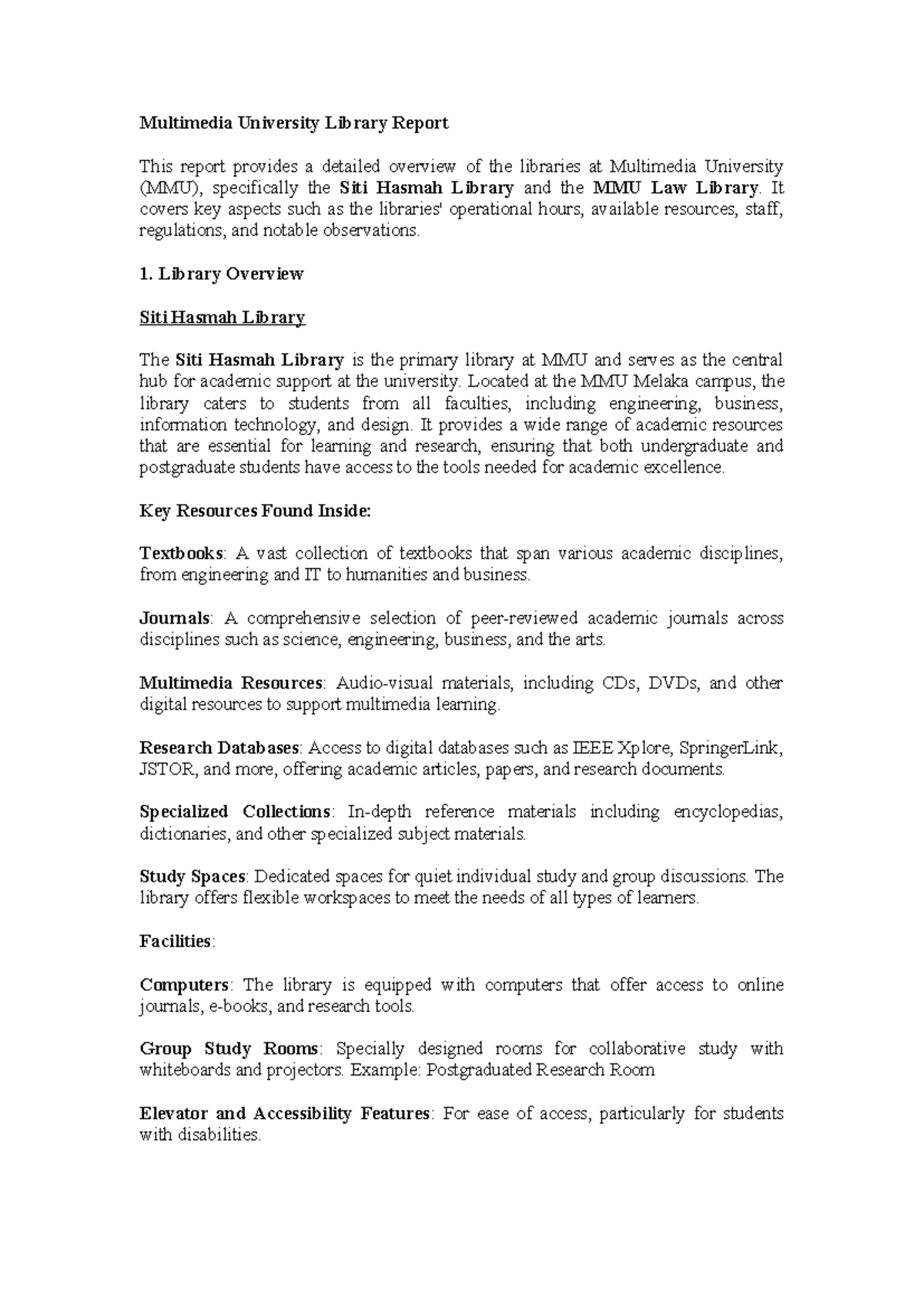 MMU Library Overview Report: Siti Hasmah & Law Libraries Analysis - Studocu