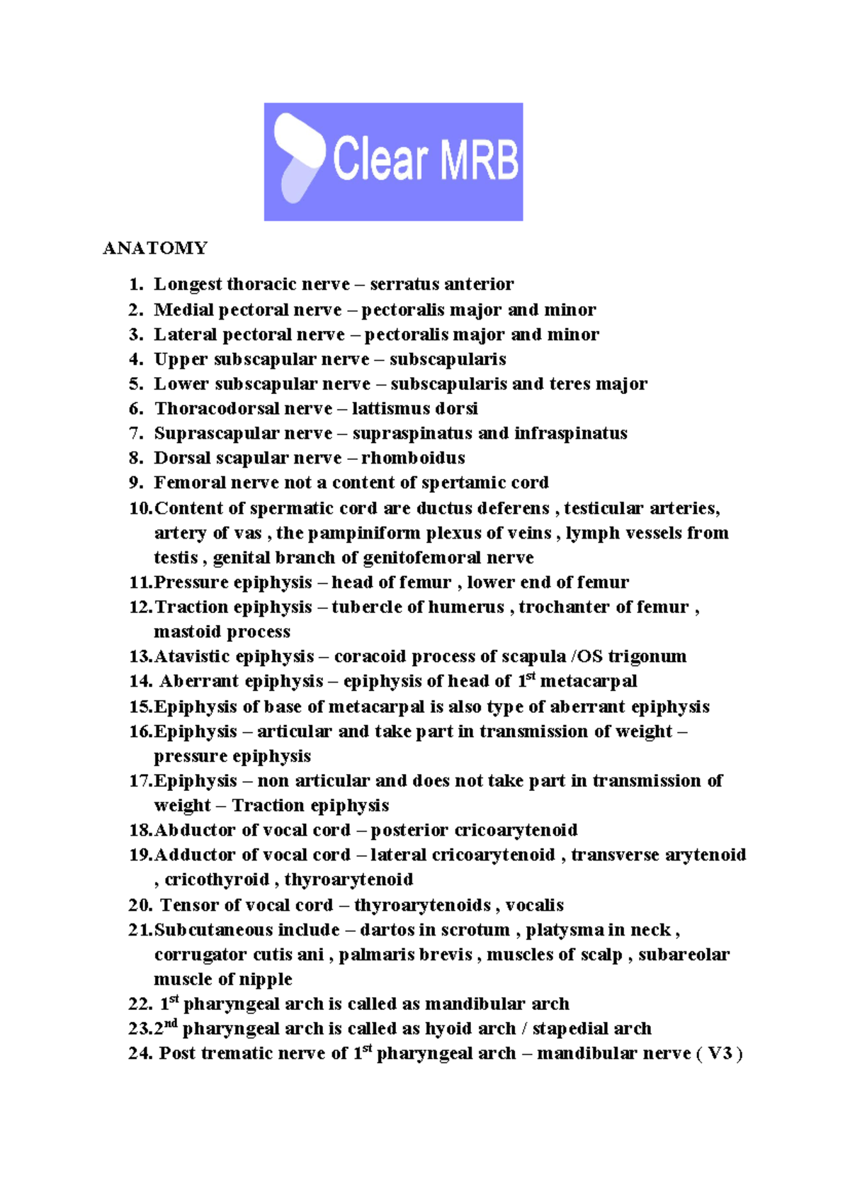 Clear MRB Anatomy - Notes - ANATOMY Longest thoracic nerve – serratus ...