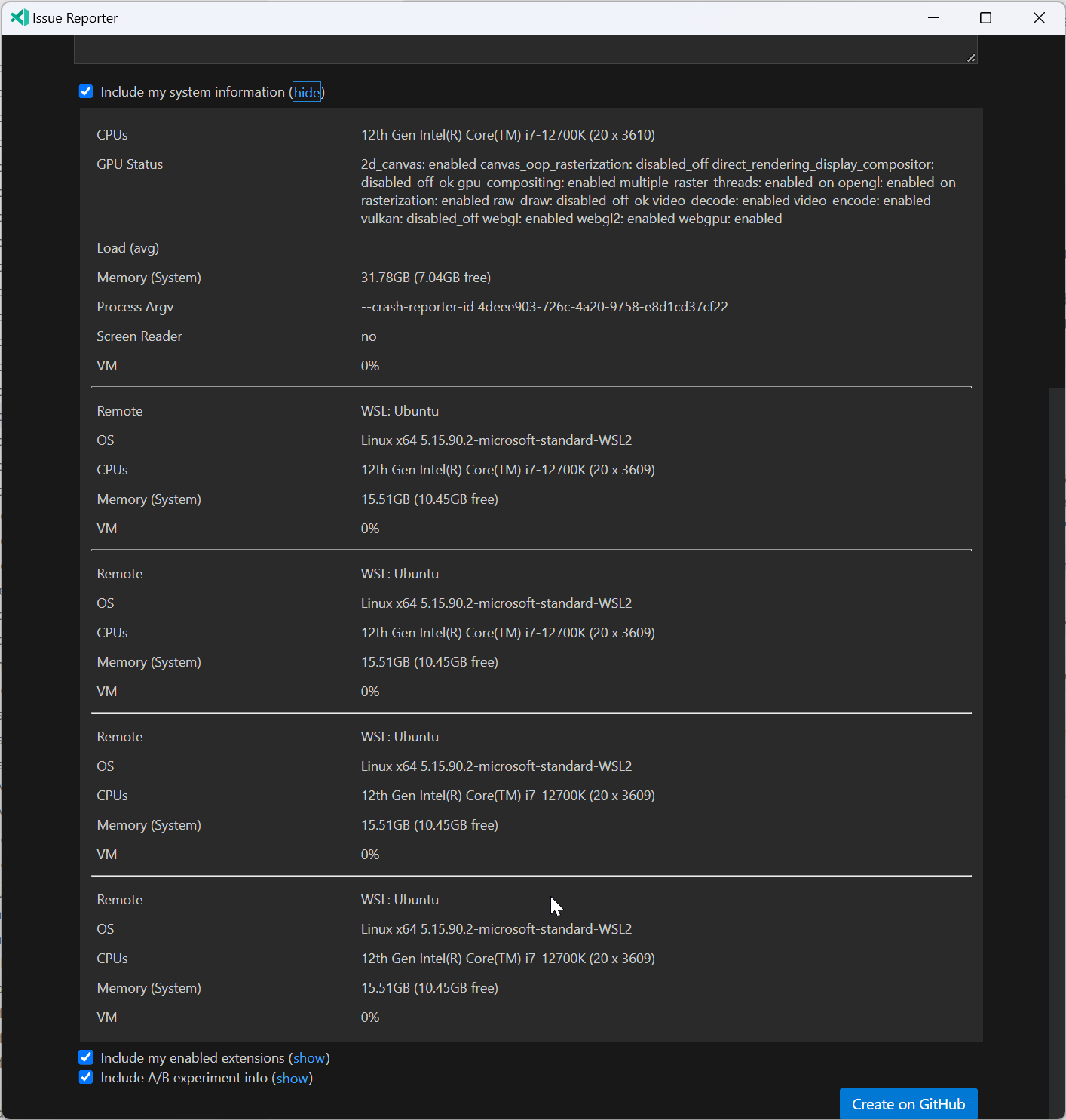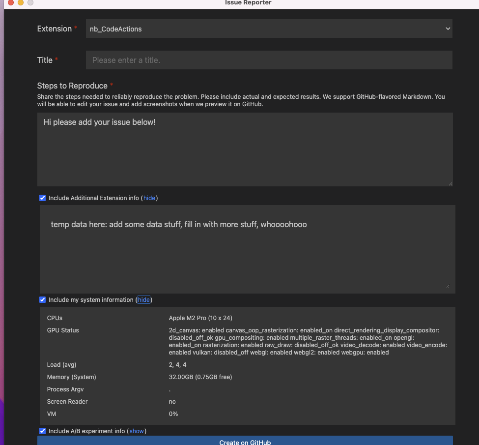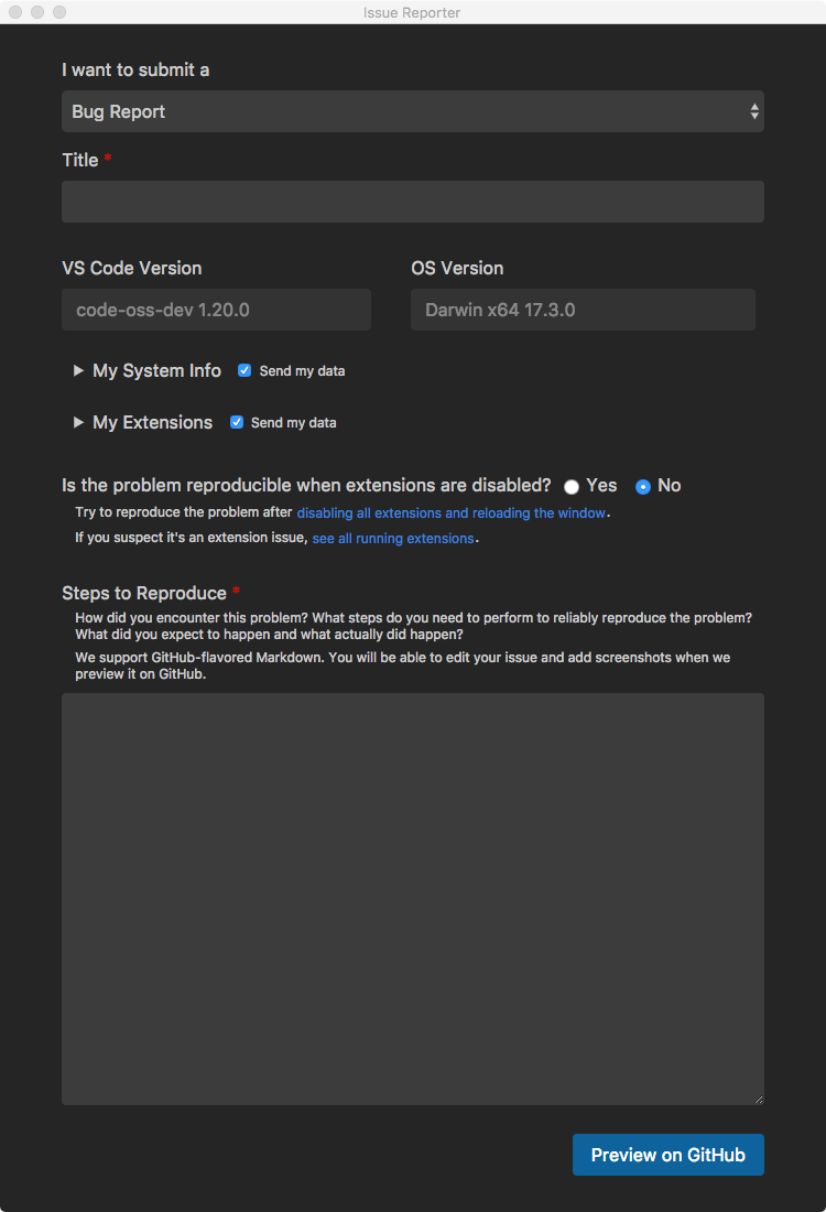 Issue reporter does nothing when "Create on GitHub" is pressed · Issue ...