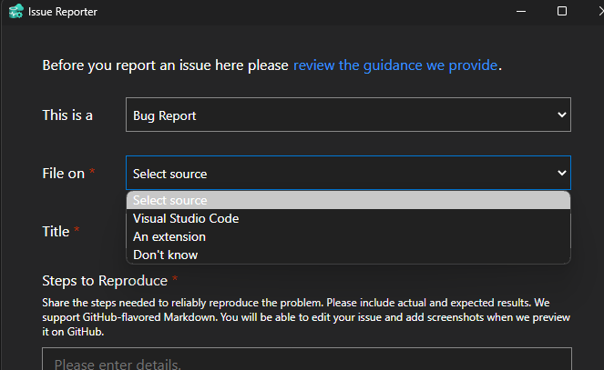 VSCode Issue Reporter shows "Don't know" as an option, but doesn't ...