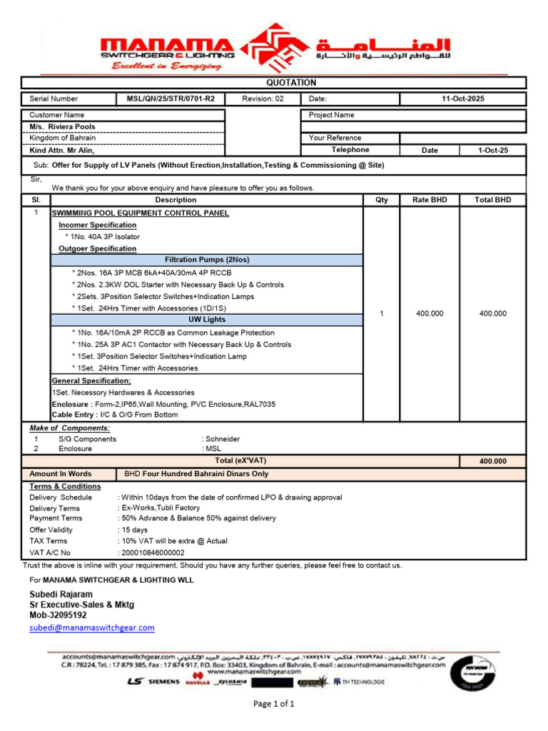 MSL QN 25 0701 R2 HS Swimming Pool Equipment Control Panel Riviera ...