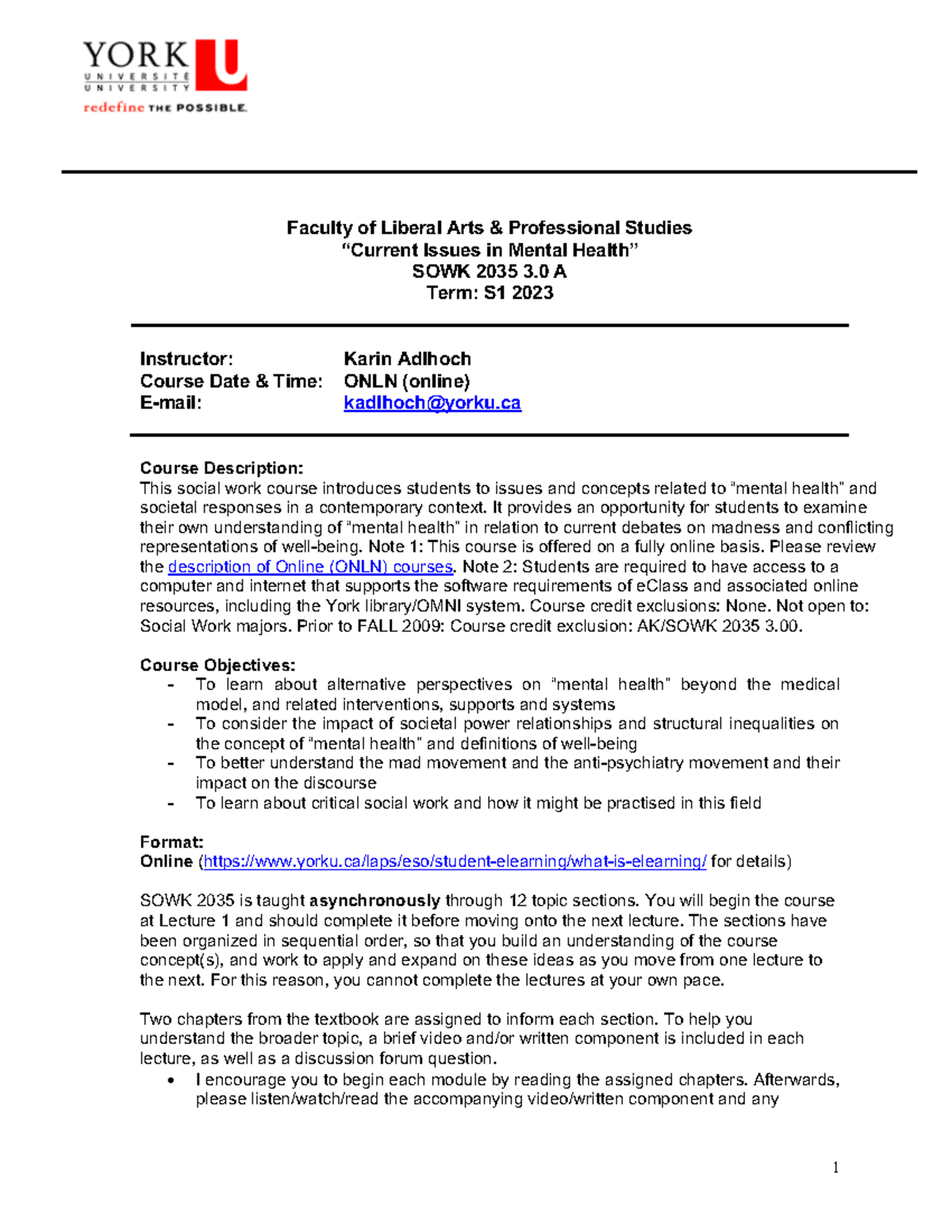 SOWK 2035 Course Outline: Issues in Mental Health - S1 2023 - Studocu
