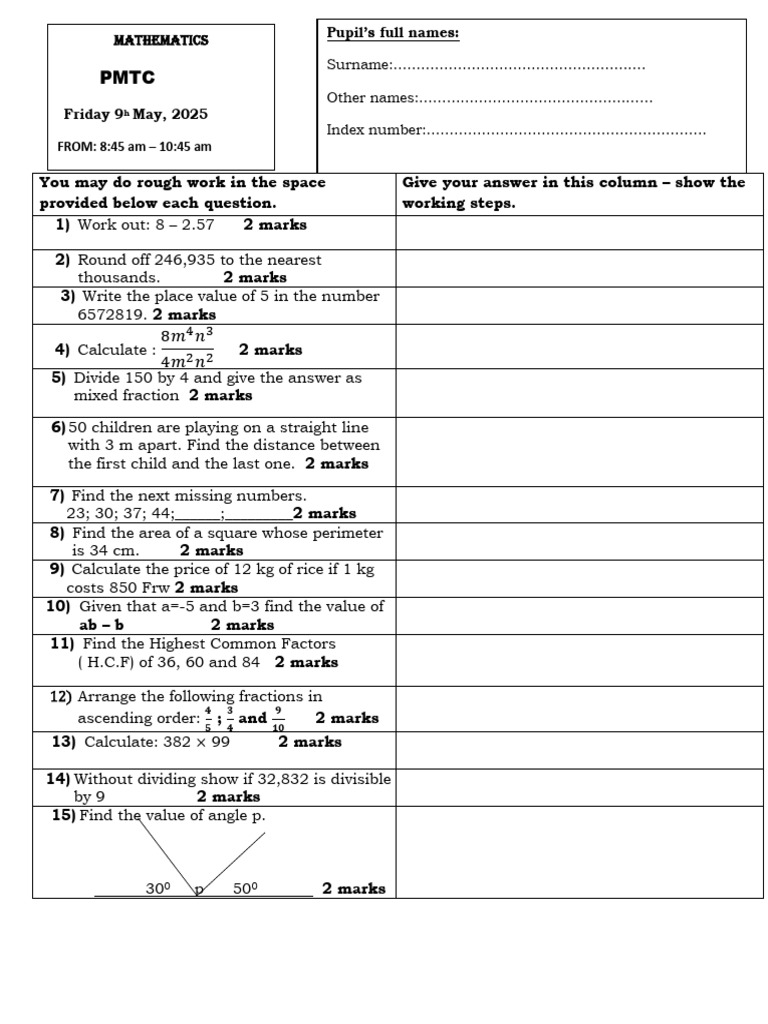 P6 MTC TEST On 9th May 2025 | PDF | Area | Mathematics