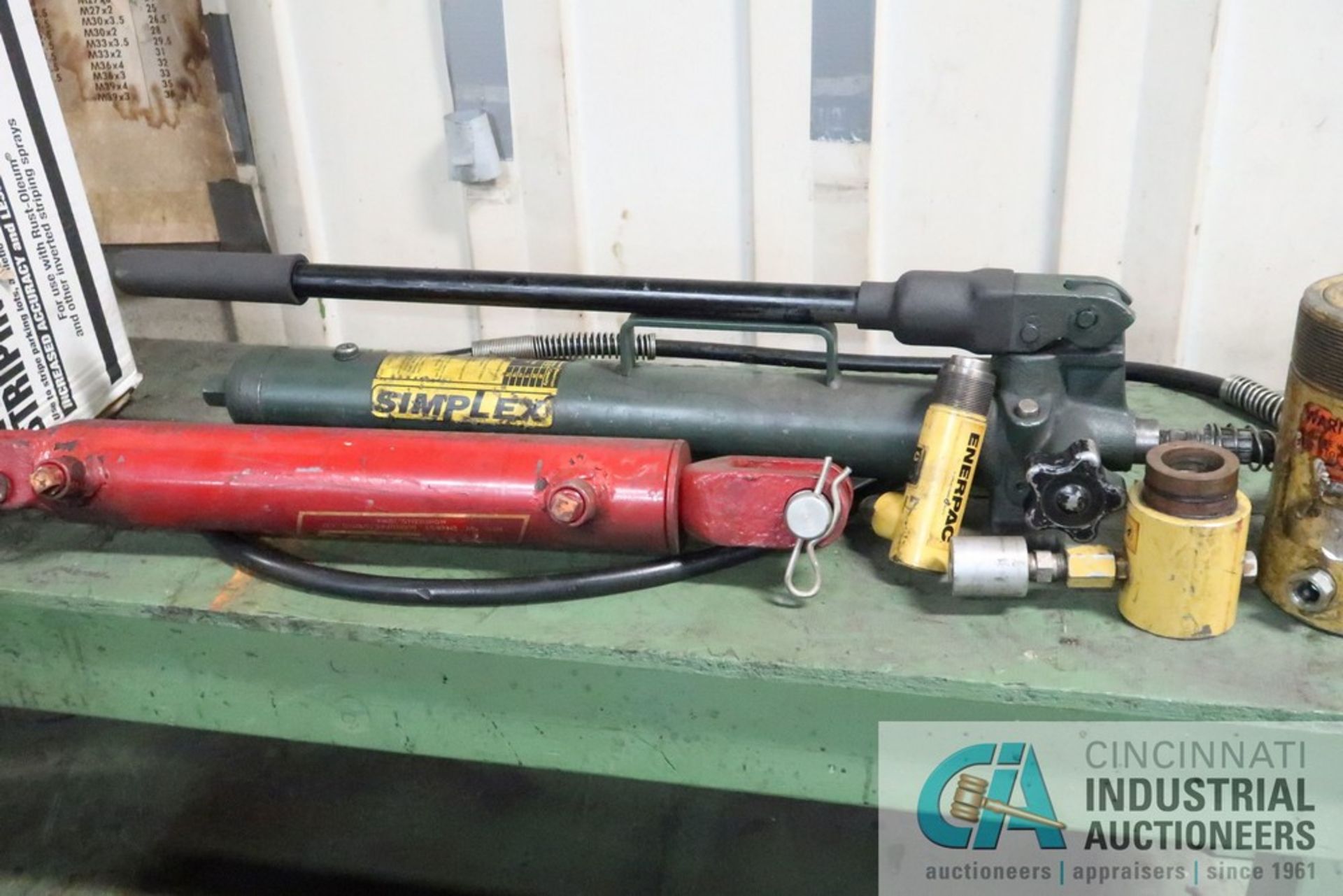 (LOT) TOOLS ON BENCH, 10 TON BANNER PORTA-POWER, SIMPLEX HAND PUMP ...