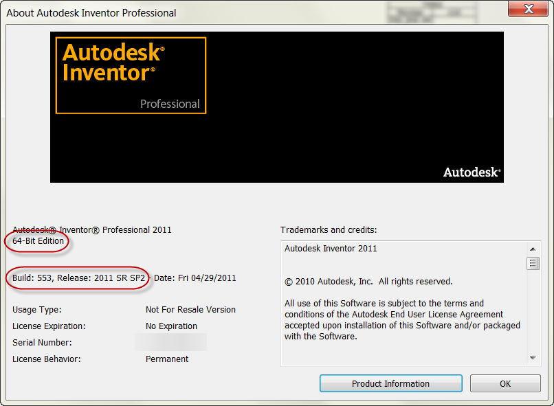 Autodesk Inventor information screen. Note the "64 Bit" & Build Numbers