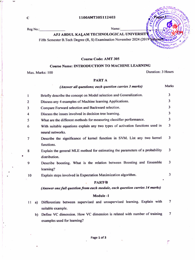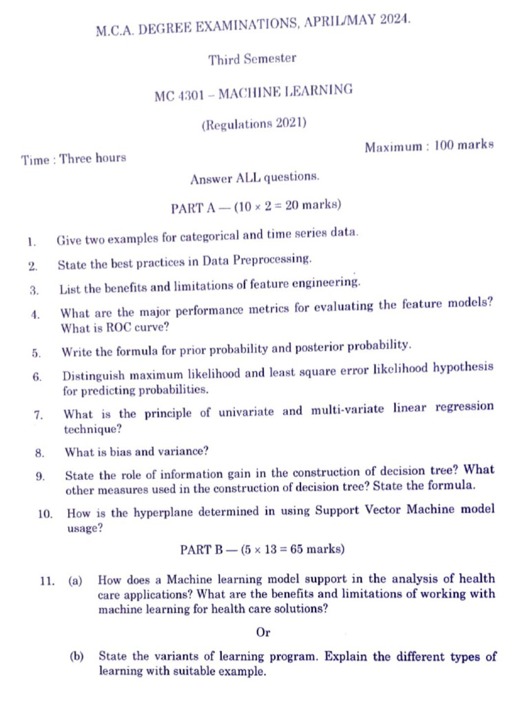 MC4301 Machine Learning Exam Paper | PDF | Machine Learning ...