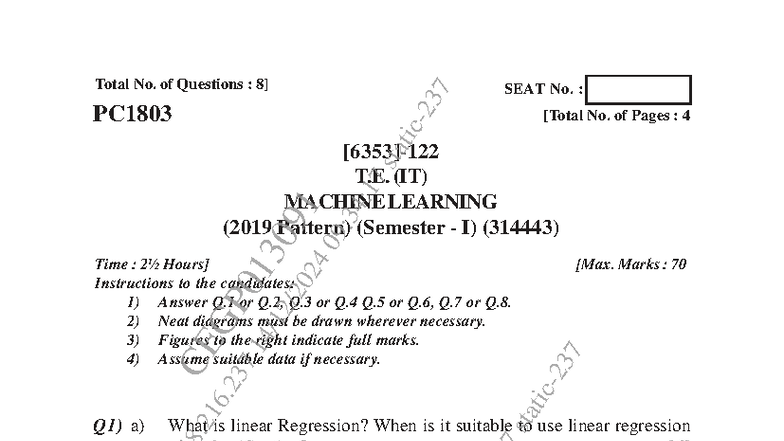 Nov Dec 2024 - PC1803 T.E. (IT) Machine Learning Exam Paper - Studocu
