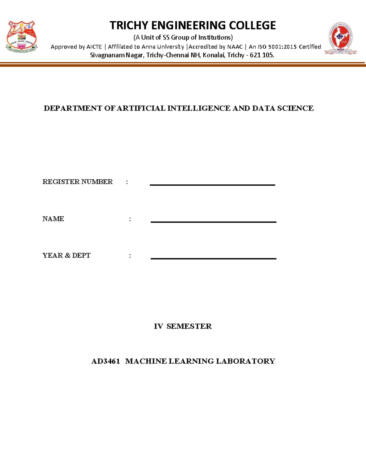 AD3461 Machine Learning Laboratory - Practical Record and Experiments ...