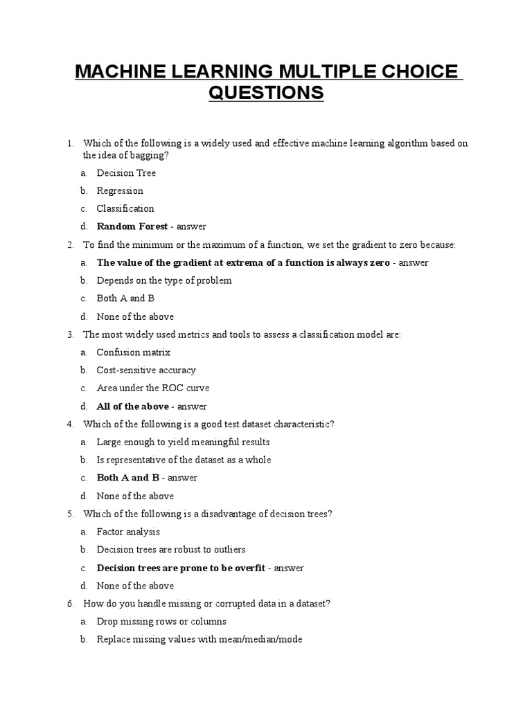 T1 Machine Learning MCQ Questions and Answers - Key | PDF | Machine ...