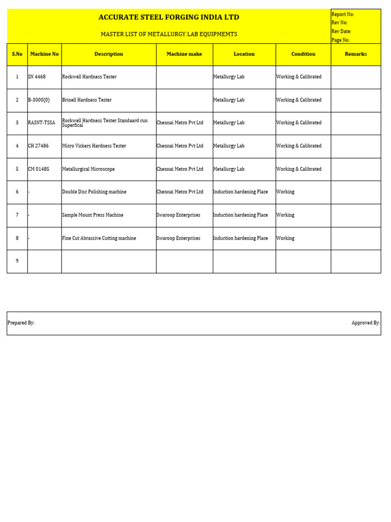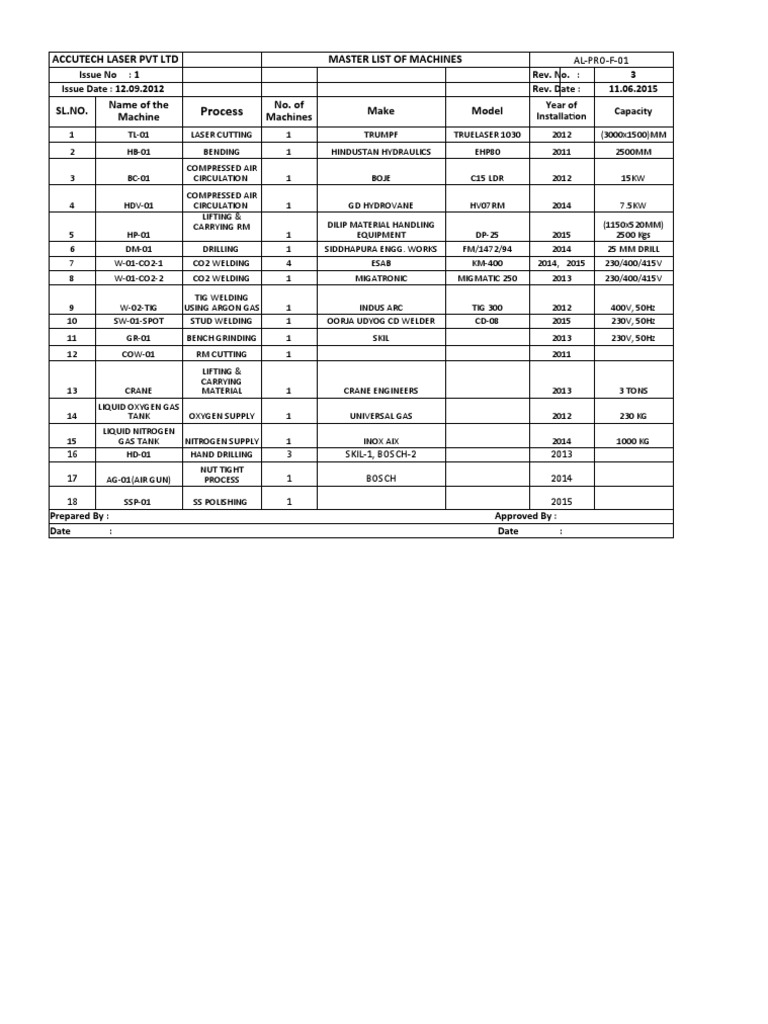 Master List of Machines: Rev - No:-00 Rev Date: - 01.10.2018 | PDF ...