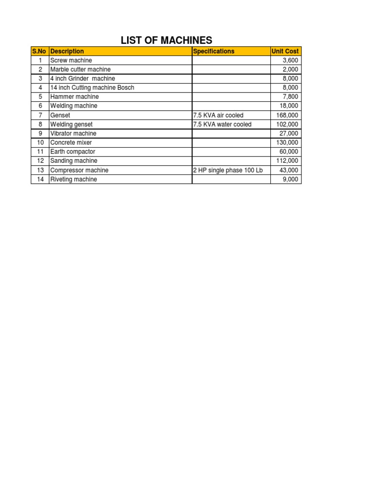 List of Machines: S.No Description Specifications Unit Cost | PDF ...