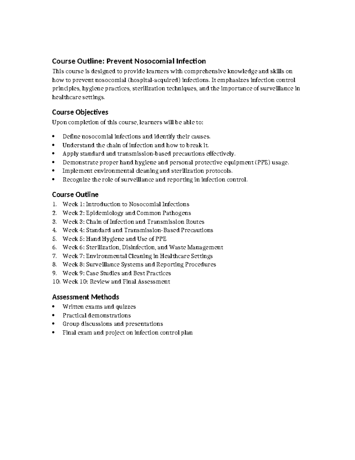 Prevent Nosocomial Infection: Course Outline & Objectives - Studocu