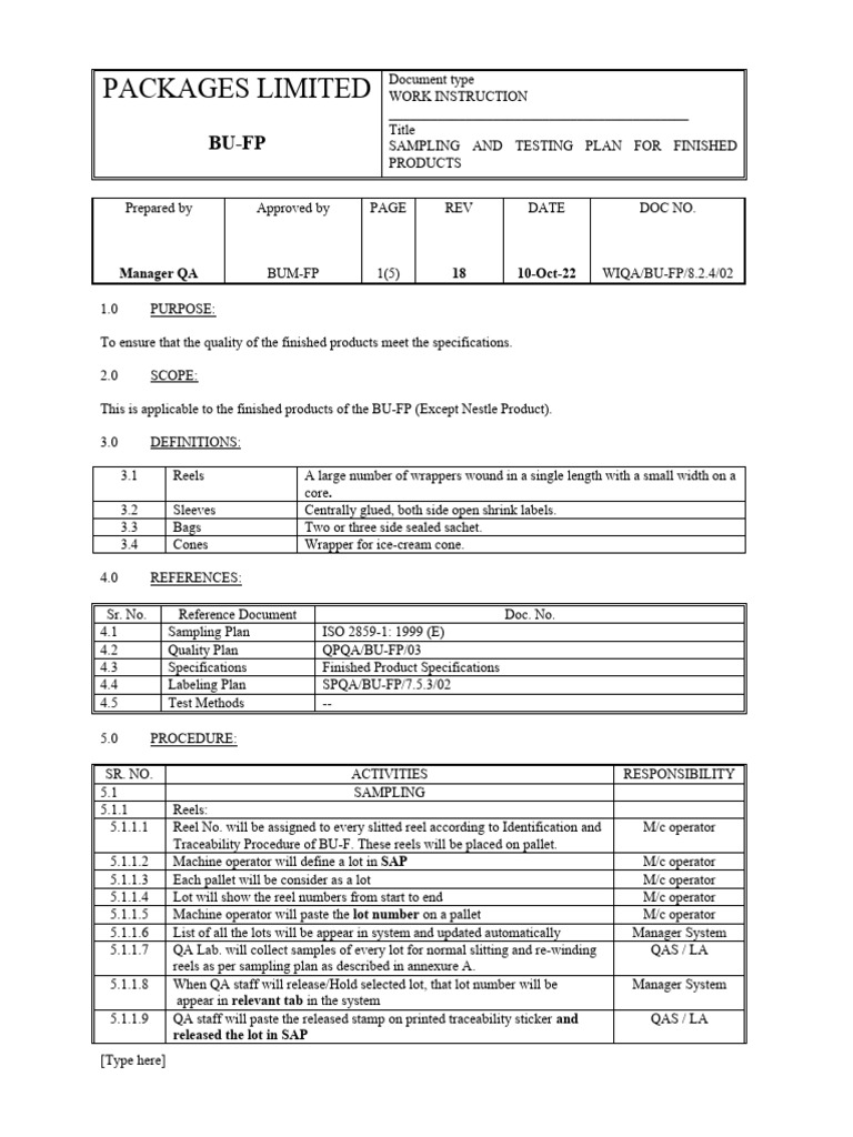 Finished Product Sampling Plan at Frank Ray blog