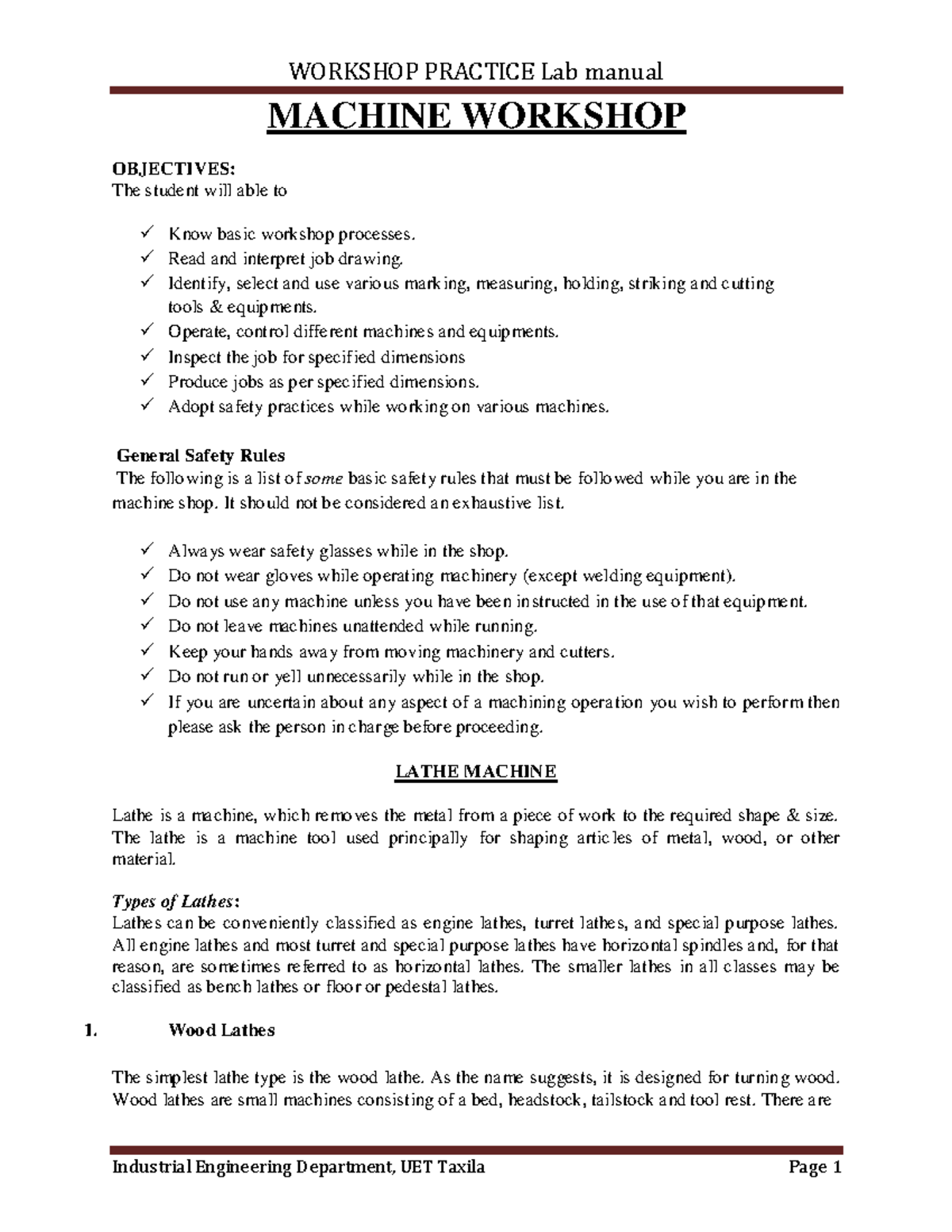 Machine Shop - Department of Mechanical & Industrial Engineering