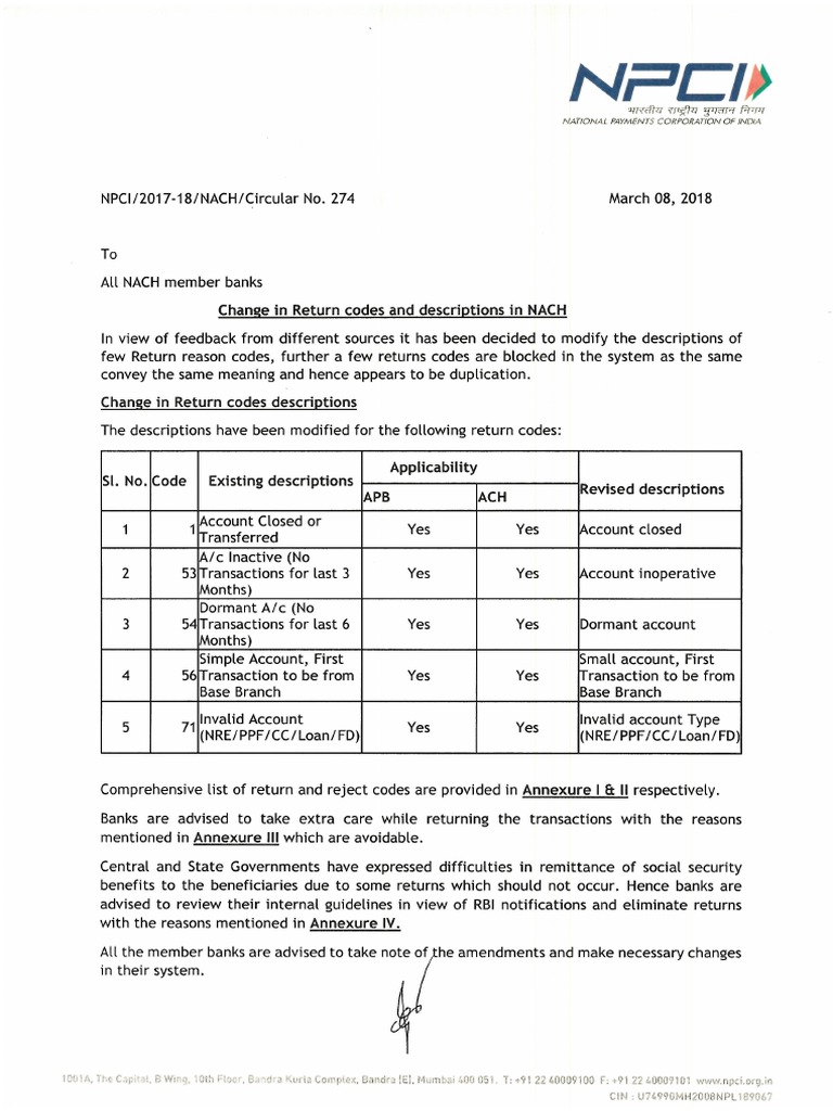 Circular No. 274 - Change in Return Codes and Descriptions in NACH | PDF