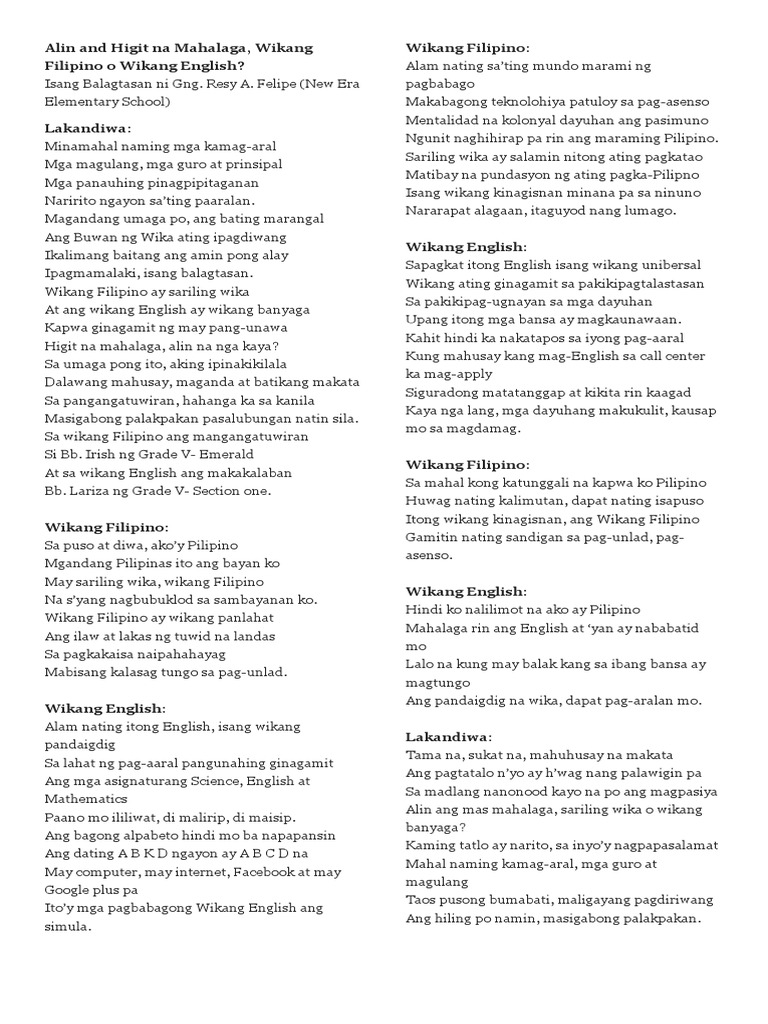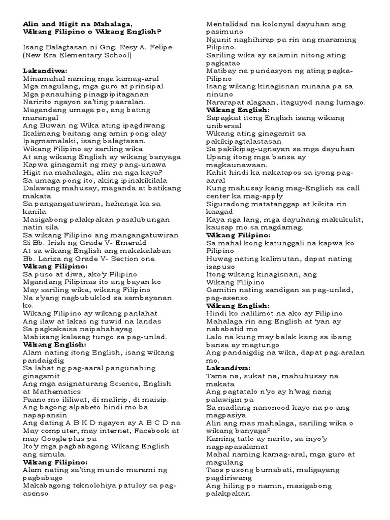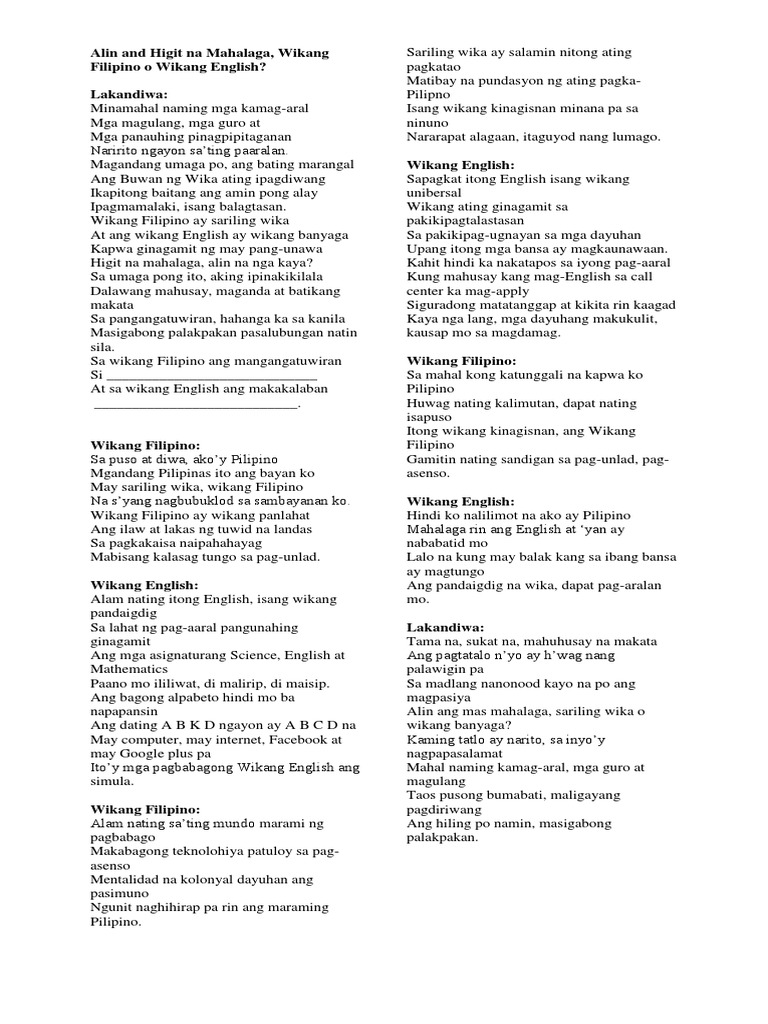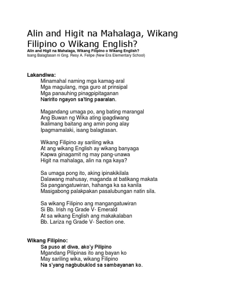 Ano Ang Mas Mahalaga Wikang Filipino O Wikang Ingles Balagtasan ...