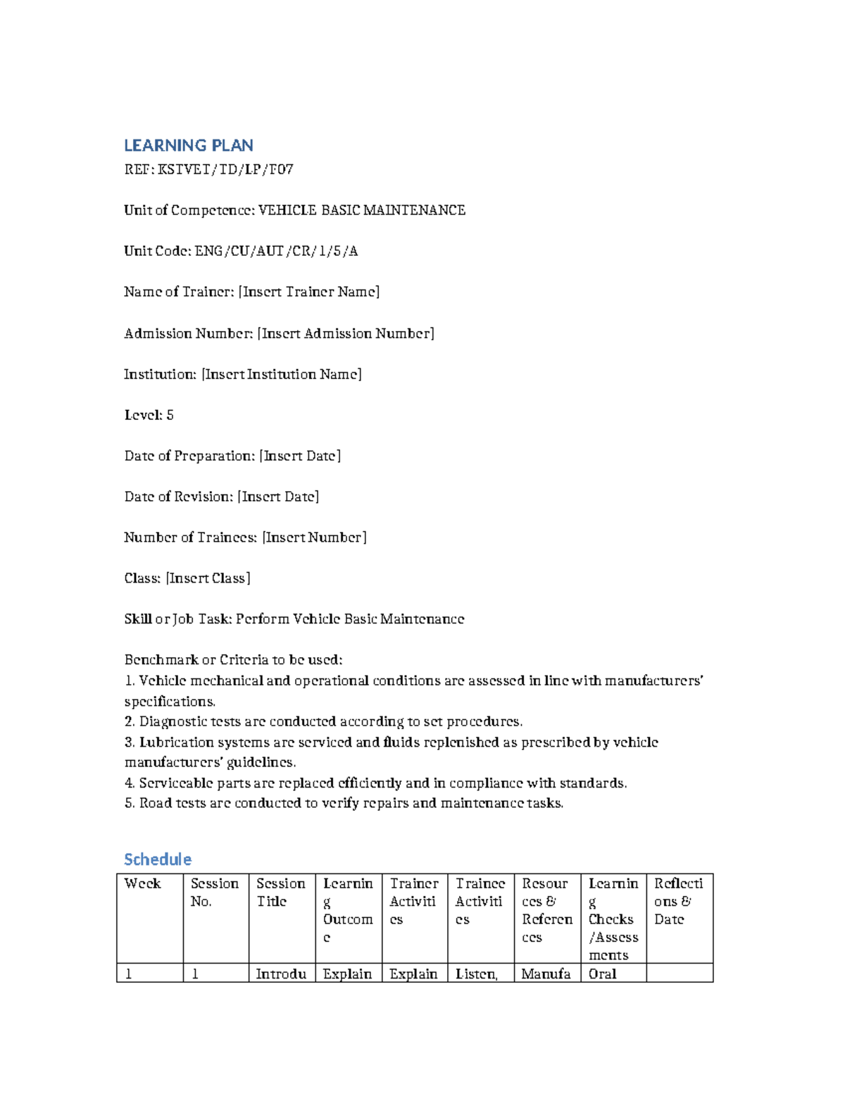 Vehicle Basic Maintenance Learning Plan (ENG/CU/AUT/CR/1/5/A) - Studocu
