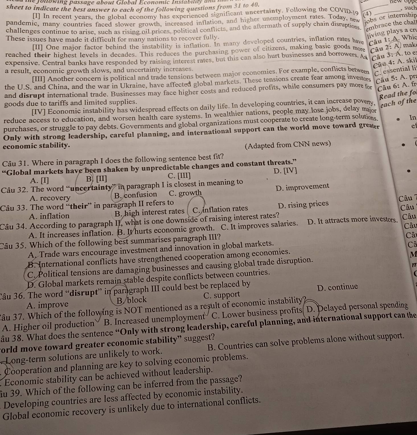 Giải quyết:ie folowing passage about Global Economic Instability and m ...