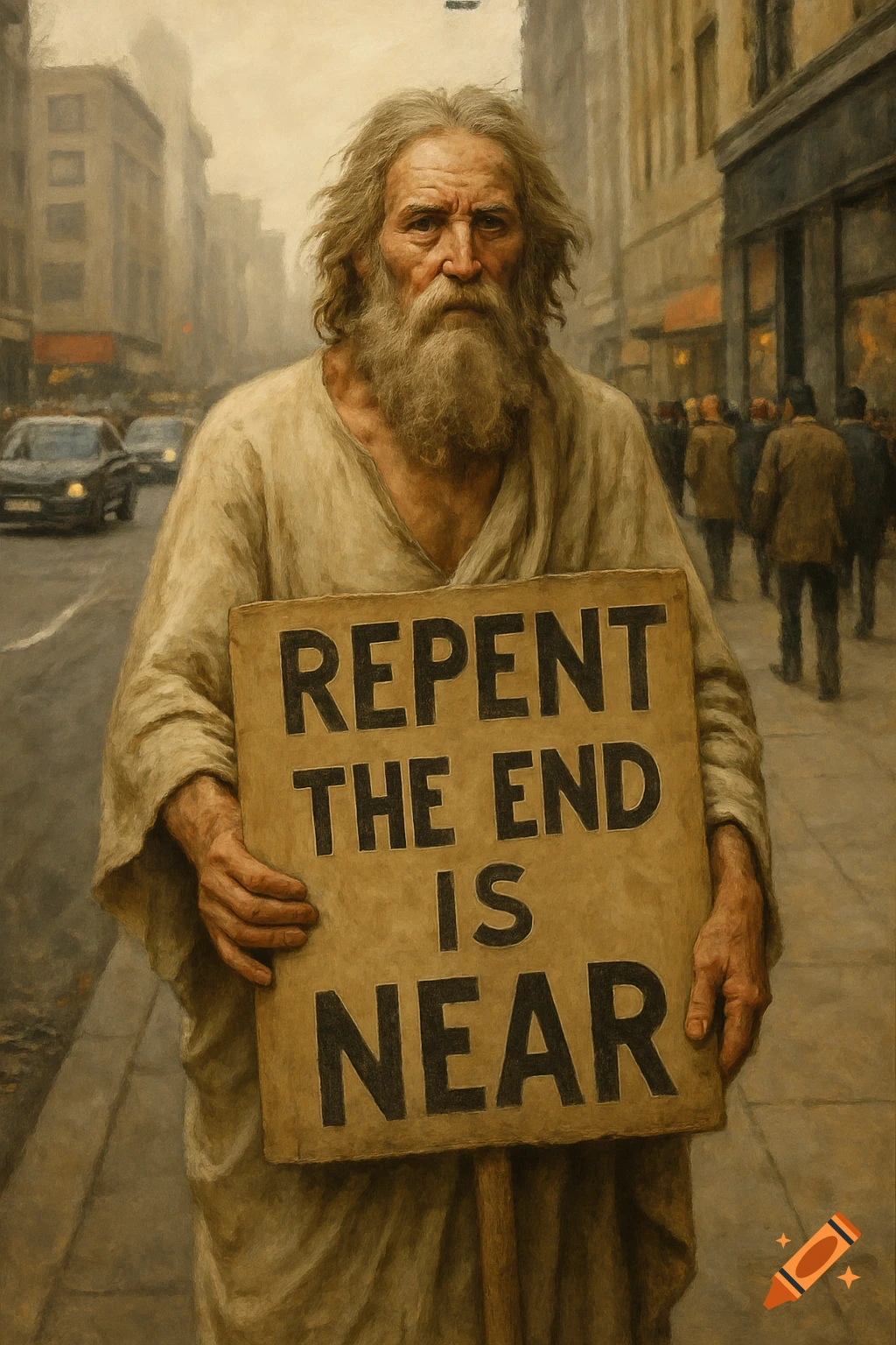 Old man with beard holds sign saying 'REPENT THE END IS NEAR' on a city ...