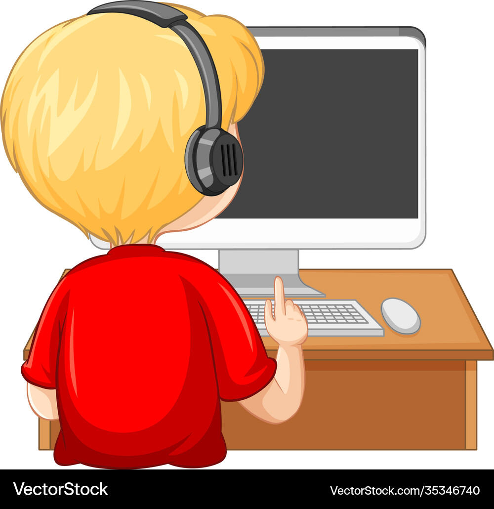 Back view a boy with computer on table white Vector Image