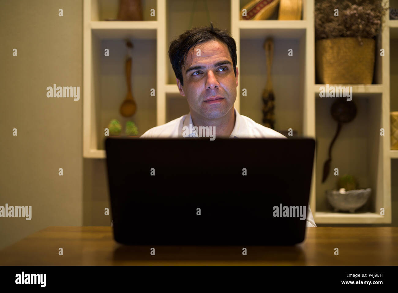 Premium Photo | An attractive young man uses his laptop computer at ...