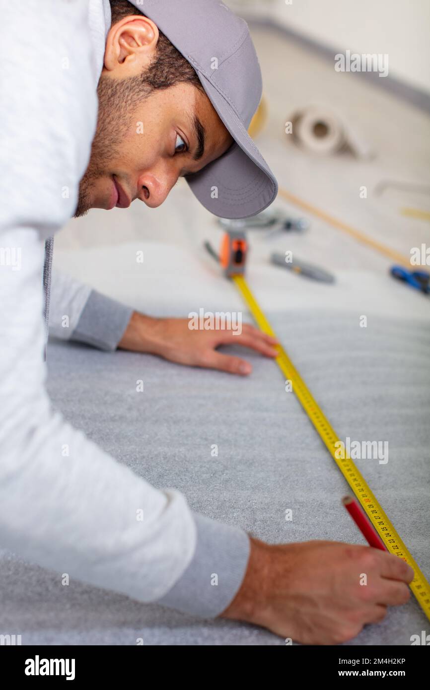 happy man measuring a wall using a ruler Stock Photo - Alamy