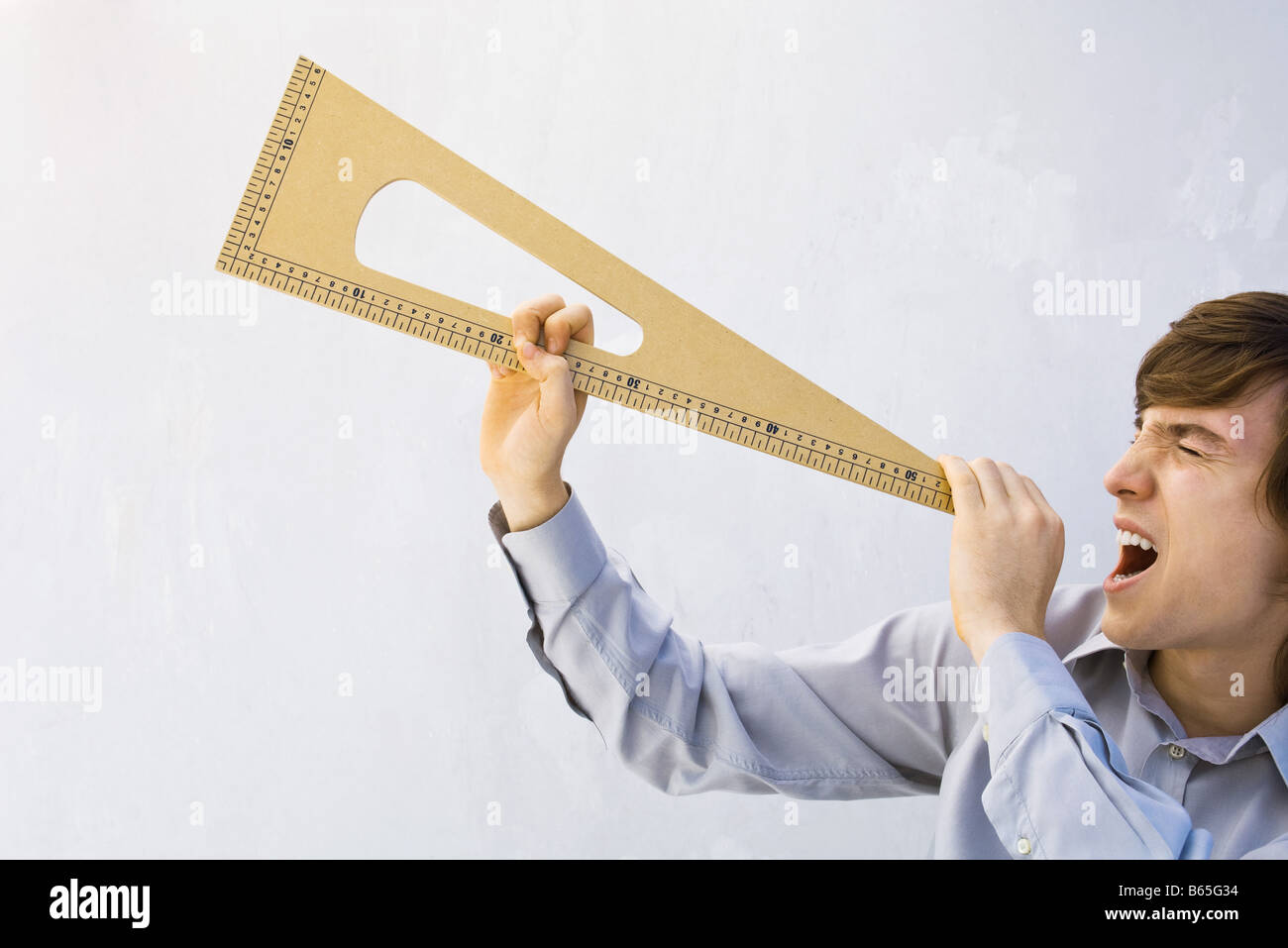 Man pretending triangular measuring instrument is a megaphone, shouting ...
