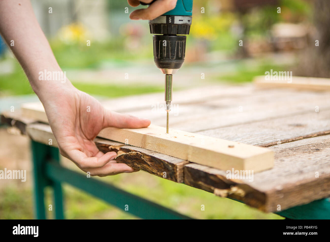 handsome young man using screwdriver for fixing table Stock Photo - Alamy
