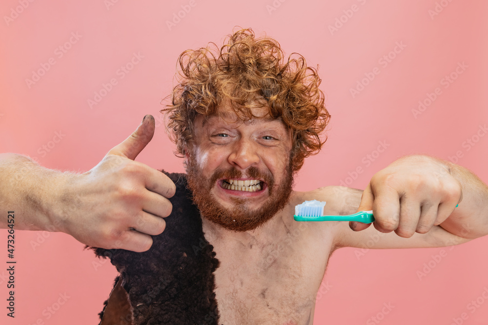 Cropped portrait of funny man in character of neanderthal brushing ...