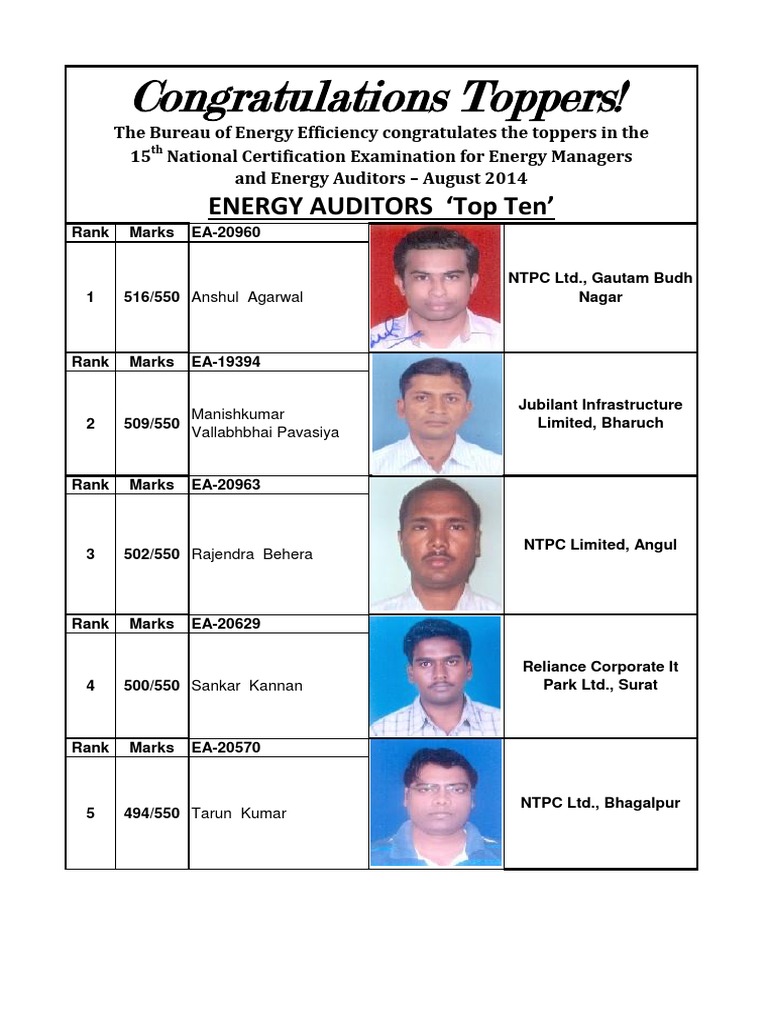 Congratulations Toppers!: Energy Auditors Top Ten' | PDF