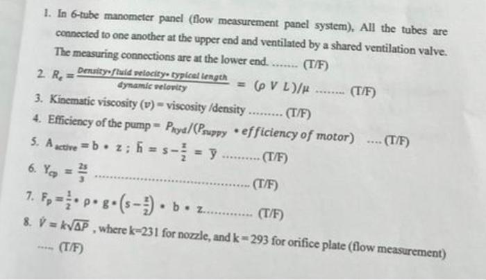 Solved 1. In 6-tube manometer panel (flow measurement panel | Chegg.com