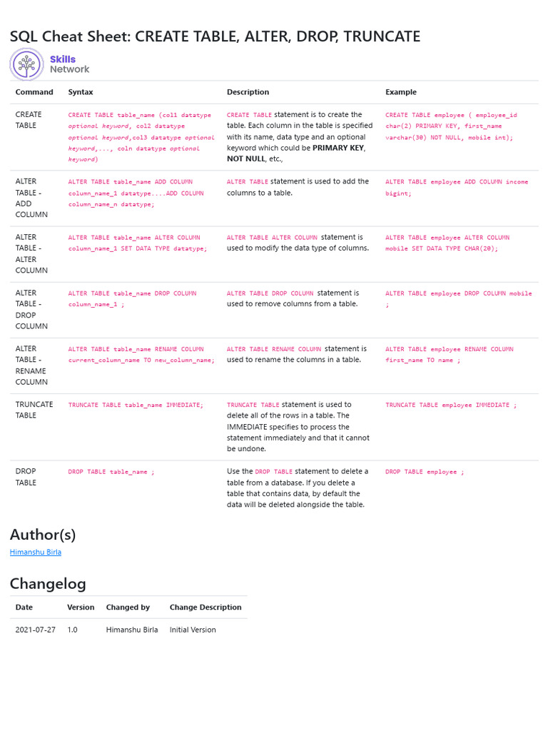 SQL Table Commands Cheat Sheet | PDF | Table (Database) | Data