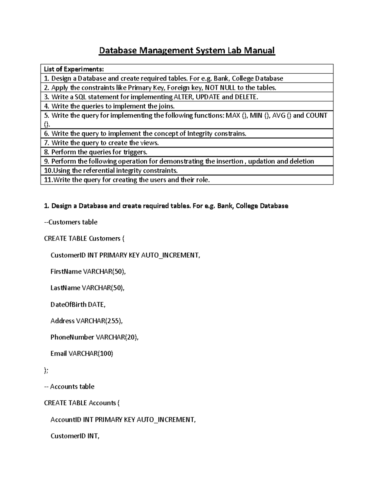 DBMS Lab Manual: Experiments on SQL Queries & Database Design - Studocu