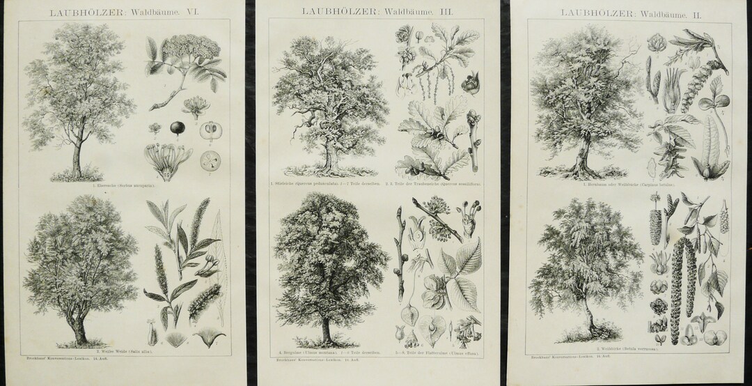 1895 Set of 3 Antique Engravings: TREES, Different Species. Botany. 129 ...