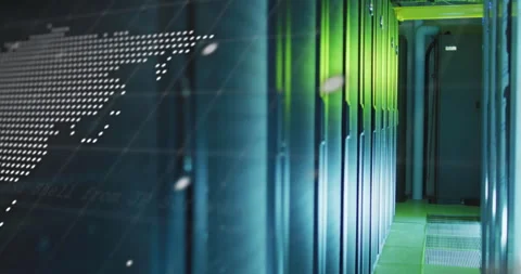 Digital data processing and analytics over server room with world map ...