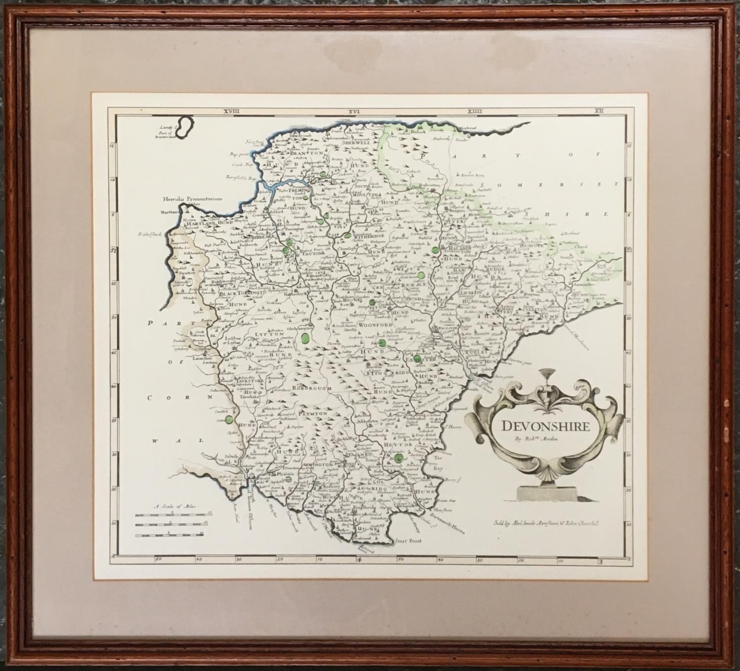 Robert Morden (1650-1703). Hand coloured engraved map of Devonshire 36 ...
