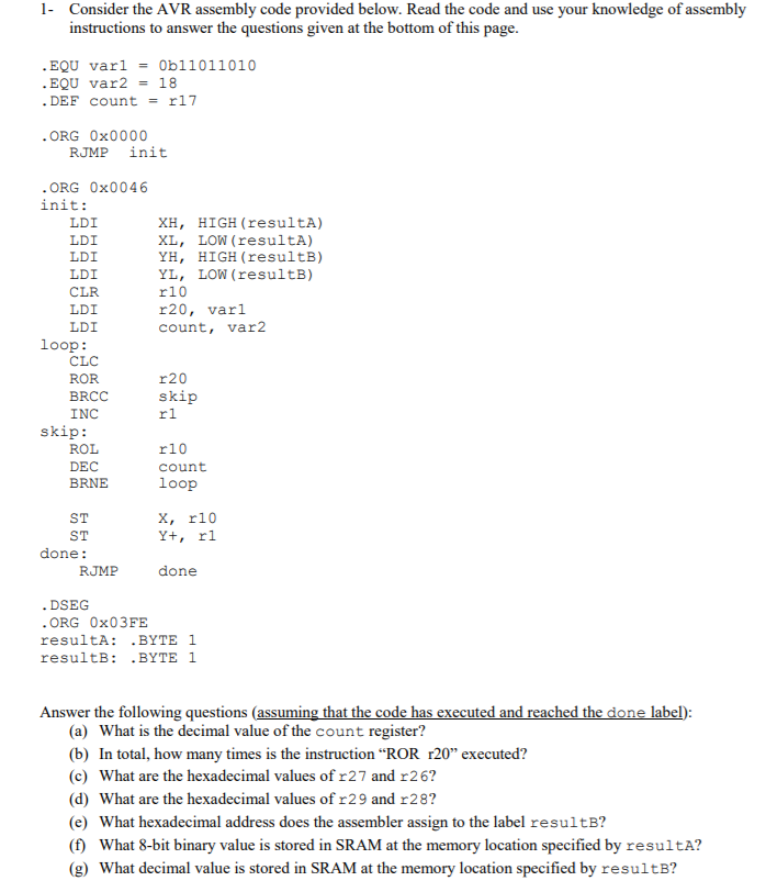 Solved 1. Consider the AVR assembly code provided below. | Chegg.com