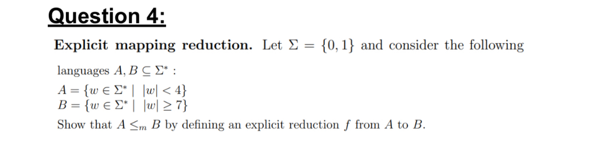 Solved Question 4:Explicit mapping reduction. Let Σ={0,1} | Chegg.com