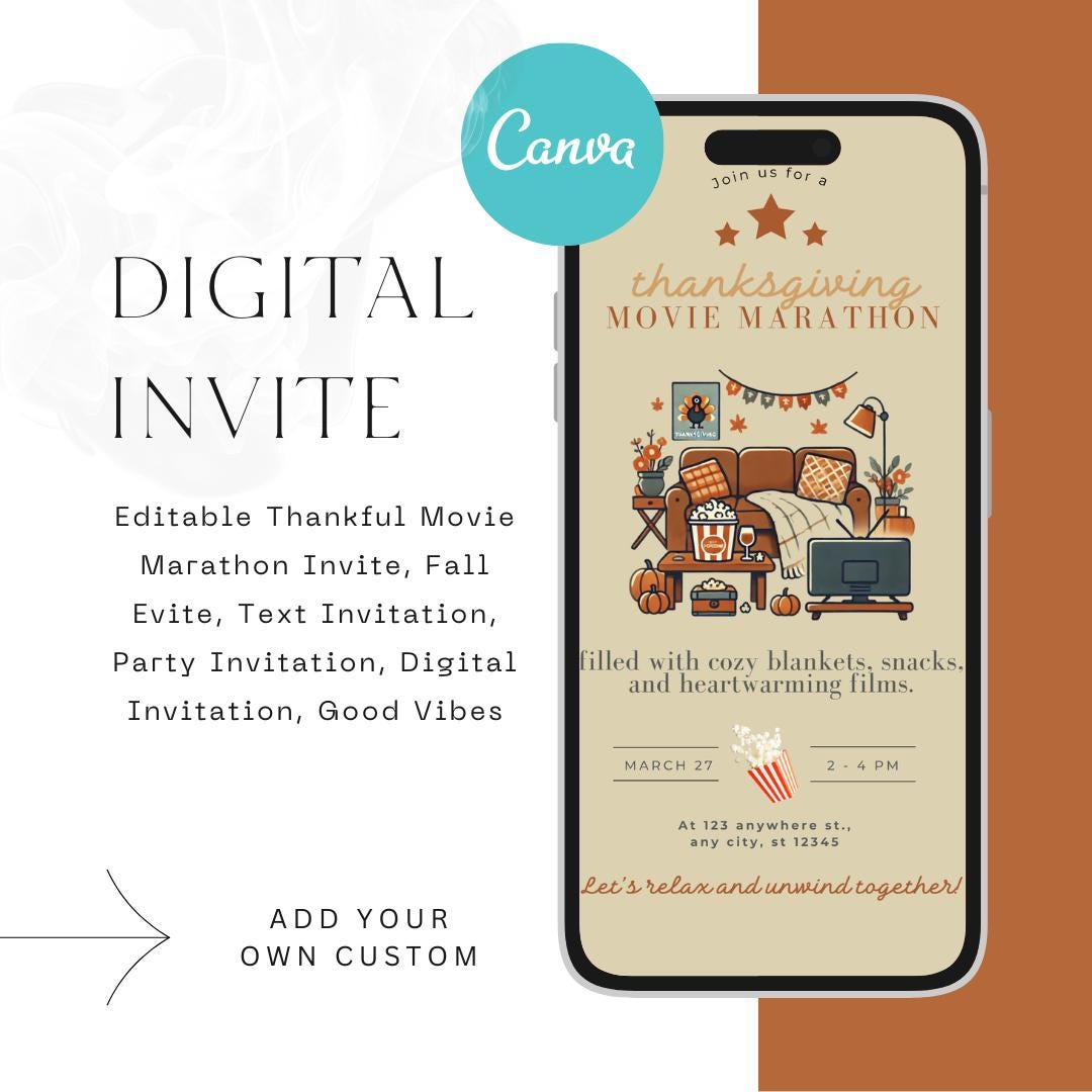 Editable Thankful Movie Marathon Invite, Fall Evite, Text Invitation ...
