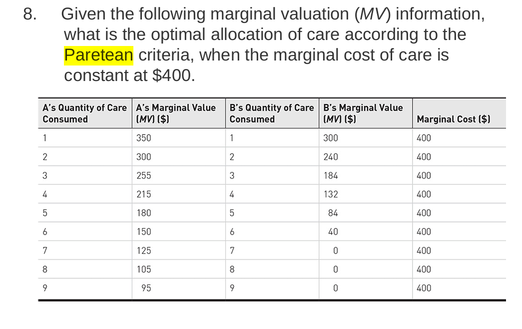 Solved 8. Given the following marginal valuation (MV) | Chegg.com
