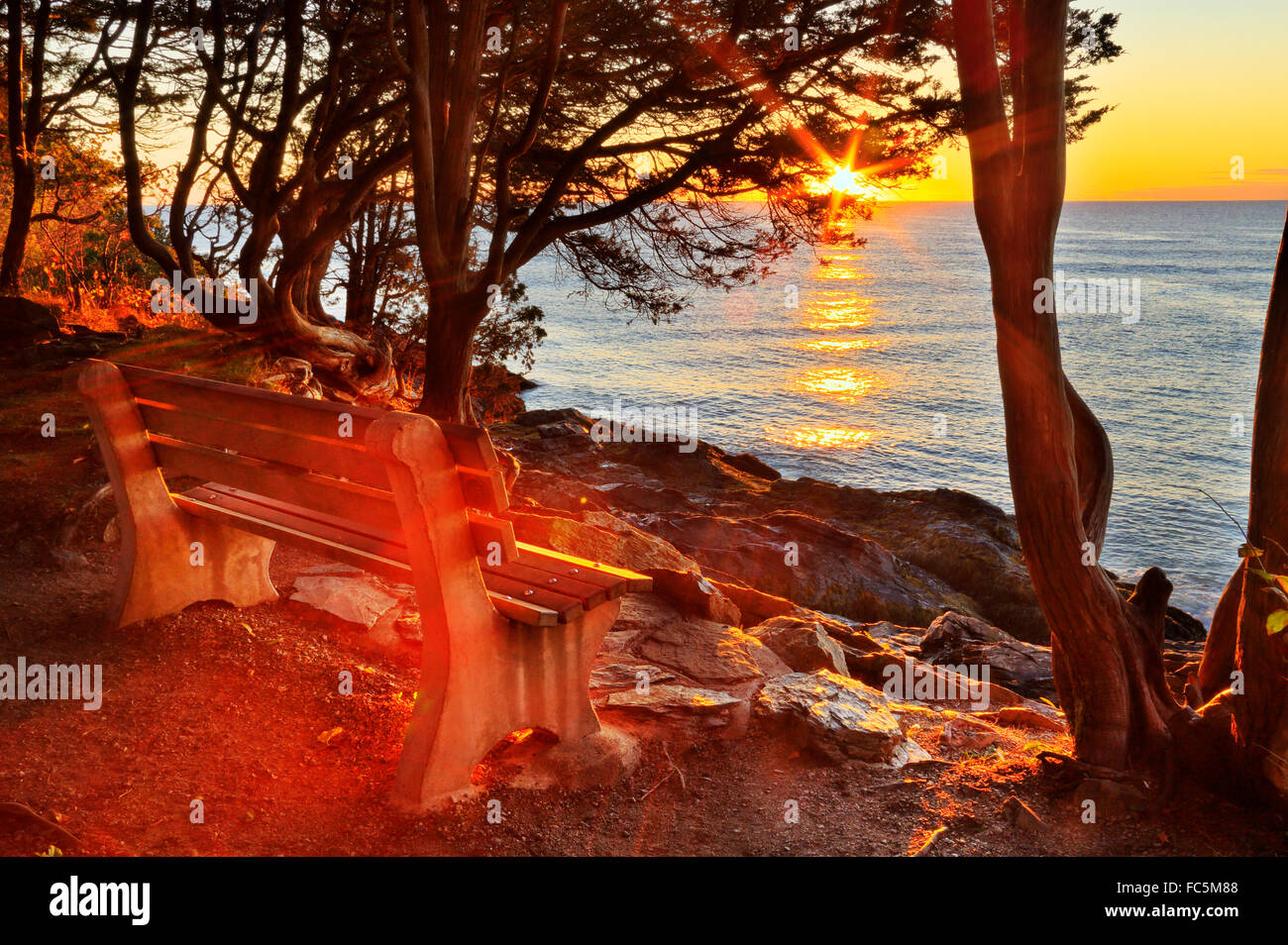 Bench on Marginal Way in Ogunquit on an autumn morning, sunrise, Maine ...