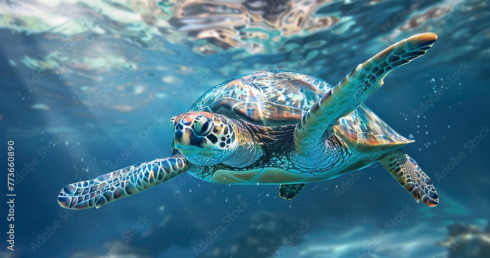 Sea Turtle gracefully swimming, ancient mariner, shell pattern detailed ...