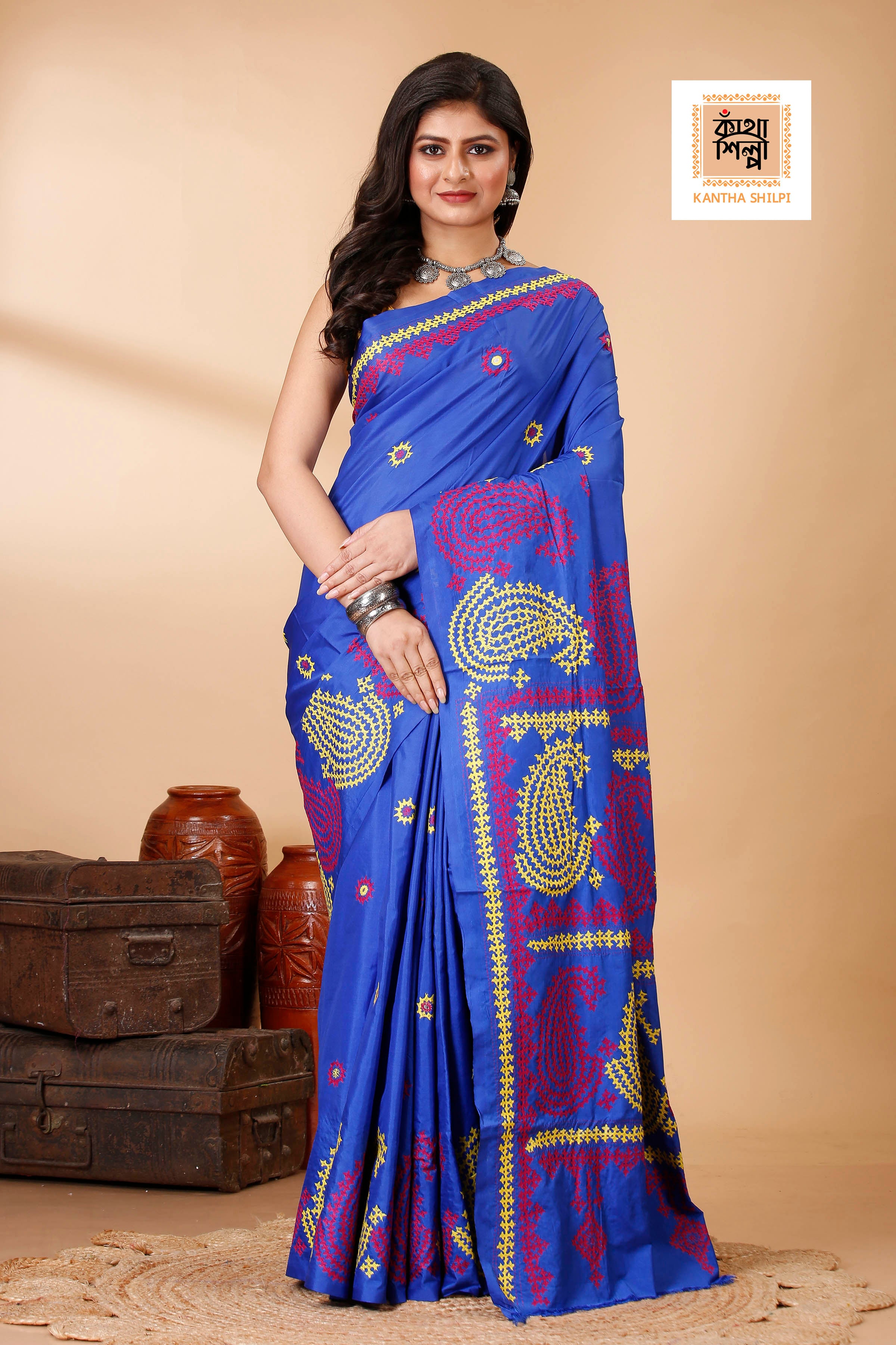 Butter Silk Yellow and Marron Thread Work Gujrati Stitch Saree – Kantha ...